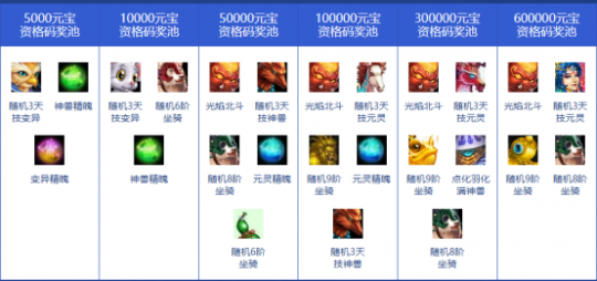 全阶段预充值奖励划分为九阶星礼,从一阶到九阶的预充值奖励分别有几率获得变异·炎炎,神兽·姑射仙子,八阶坐骑·逍遥鹤,八阶坐骑·混世大荒,神兽·九耳,神兽·绿玉君,以及全新元灵·天竺公主,全新九阶坐骑·星河巨骨刺和银汉九曜鲲。