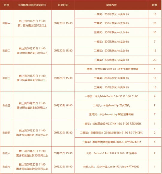 每达到30/100/300/800/1500/3000/6000元的充值额度,都可以获得一个抽奖资格码,最多可累积获得7个抽奖资格码。所有奖品将从抽奖资格码中抽取,各阶段奖励详情及开奖时间请参见活动页面图示。赶快抓住机会,赢取属于您的丰厚奖品吧!