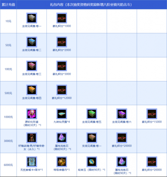 即日起至10月6日,在新服“妖灵觉醒”进行充值活动,就可以参加累充刮豪礼活动,只要在此期间累计充值金额达到指定标准,即可获得丰厚的充值礼包,内含主线见闻录、九转仙灵露、永久时装“轩辕战魂·男/轩辕传奇·女”、属性洗炼石、轮转玉以及海量豪礼积分等奖励。