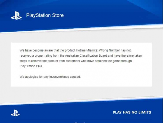 索尼在本周发给用户的邮件中解释了删除游戏和退款的原因:“我们意识到,《迈阿密热线2:空号》这款产品尚未获得澳大利亚分级委员会的适当评级,因此以采取措施向购买该游戏的客户退款。我们已将产品的总购买价格退款至您原本的付款方式。”